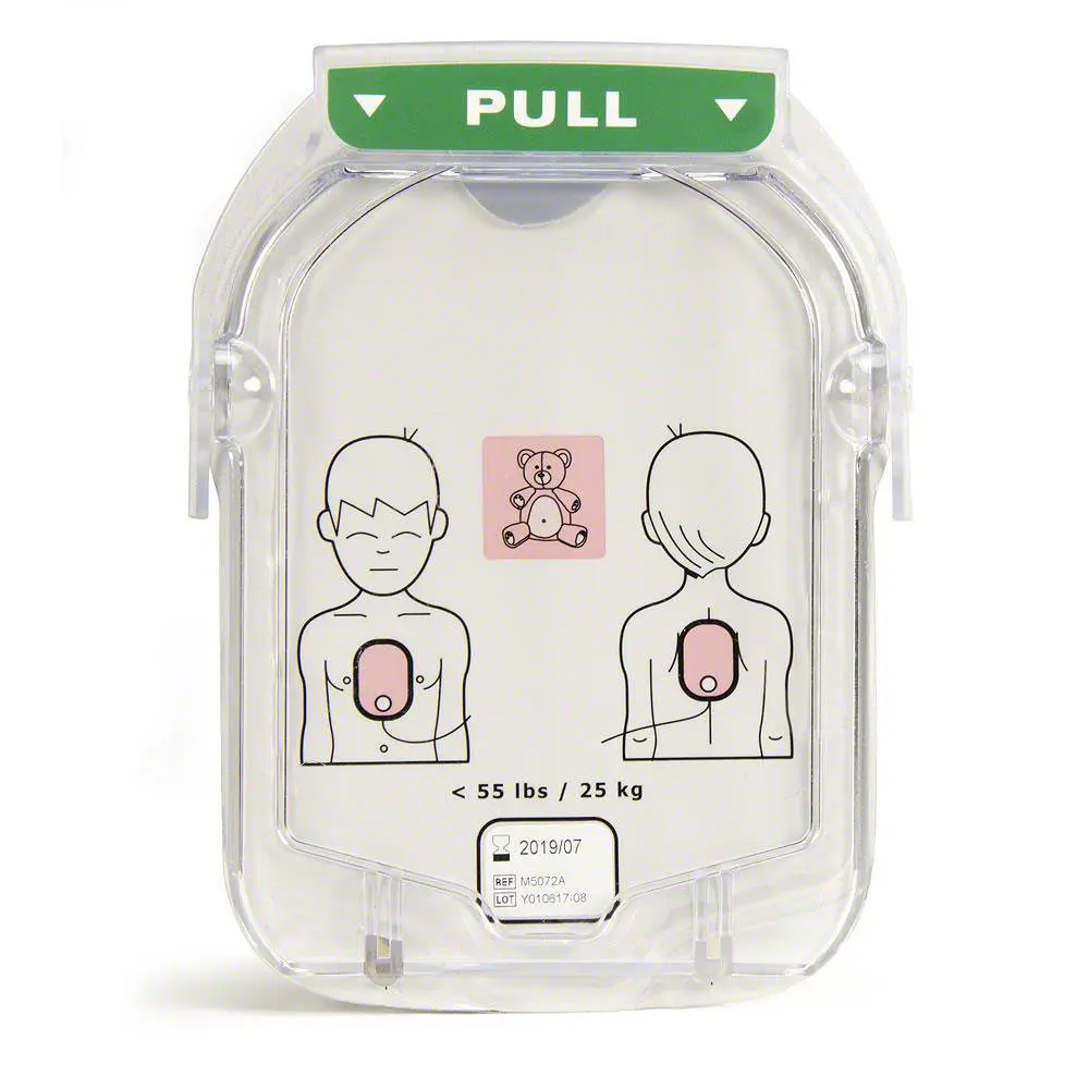 Philips Heartstart aed pediatric pads have an expiration of 2-years and are designed to work with the Philips HeartStart home AED defibrillator or the Philips Onsite. These two AEDS give step by step voice instructions appropriate for a pediatric (child) patient once the pediatric pads are inserted. The Philips m5072a infant child pads cartridge automatically reduces the energy of its shock from an adult dose of 150 Joules to a child appropriate dose of 50 Joules. Children under 8 years of age or weighing less than 55 pounds (25 kg), including infants, should be treated using M5072A defibrillation pads if available. So, the rescuer can easily identify the difference between the adult pads and the pediatric pads they are clearly marked with the photo of a teddy bear and a photo of a child is printed on them.